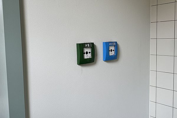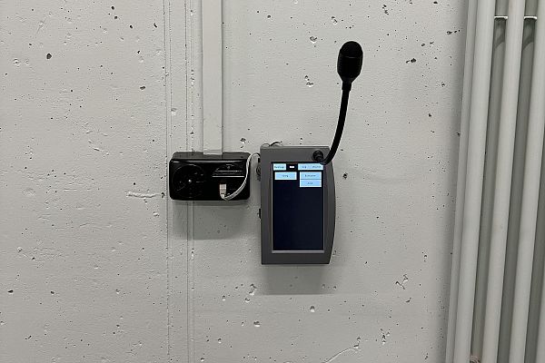 Die Auslösung im Evak-Fall erfolgt direkt ab Zentrale, von der Sprechstelle im UG oder mittels Evak-Taste, die sich an der Wand in den sanitären Anlagen im EG befindet. Eine Evakuierung kann auch im Falle eines Stromausfalls erfolgen, da die neue 4 EVAK-Anlage mit Batterien ausgestattet ist. Dadurch kann innerhalb 24 Stunden eine mindestens halbstündige Räumung erfolgen. Der Amok-Alarm kann via Sprechstelle oder Amok-Taste erfolgen. In 20 Räumen ist zudem die Verkabelung für zusätzliche Amok-Taster vorbereitet. Für eine flächendeckende Beschallung der Räumlichkeiten wurden insgesamt 53 Decken- und ein Aussenlautsprecher in der Wunschfarbe montiert.