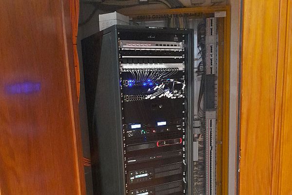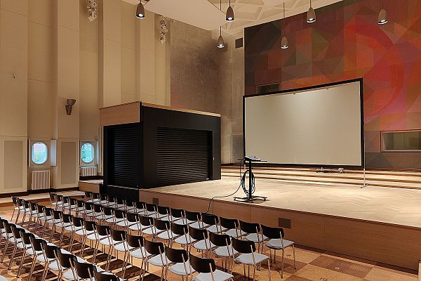 Im Studio 2 sorgt eine leistungsstarke Beschallungsanlage inkl. Mikrofone und Projektor für beeindruckende Klang- und Bildübertragung. Für eine optimale Klangverteilung im Saal wurden unterhalb der Bühne auf beiden Seiten je zwei Subwoofer installiert, ergänzt durch zwei breit abstrahlende Winkel-Lautsprecher, die ein immersives und gleichmässiges Klangerlebnis im gesamten Raum ermöglichen. Die gesamte Präsentationstechnik wird komfortabel über ein mobiles Touchpanel bedient. Alle Komponenten sind in ein modernes AMX-Steuerungssystem eingebunden, sodass sich sämtliche audiovisuellen Elemente einfach, intuitiv und zuverlässig steuern lassen.
